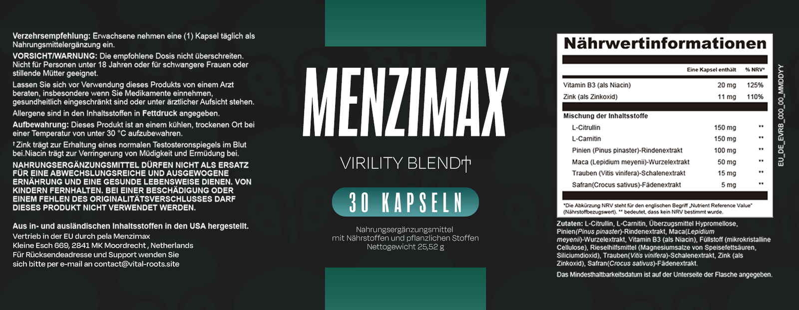 Menzimax™ Virility Blend kombiniert wichtige Nährstoffe wie L-Citrullin, L-Carnitin, Zink, Maca, Pinus Pinaster, Traubenkernextrakt, Safran und Niacin — entwickelt zur Unterstützung von Energie, Leistungsfähigkeit, Wohlbefinden und männlicher Vitalität.